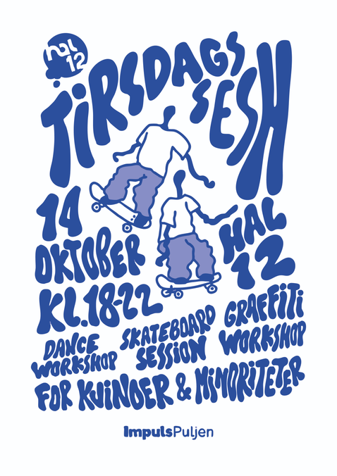 afholder tirsdags session i hal 12 skatepark, en ekstra special session, med hygge danse workshop, graffiti workshop og mega fed skateboard session fra kl. 18.00 til 22.00