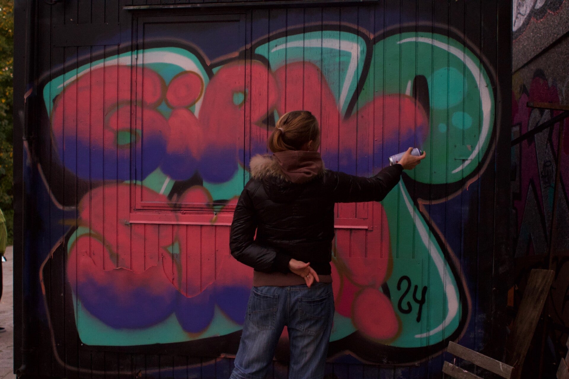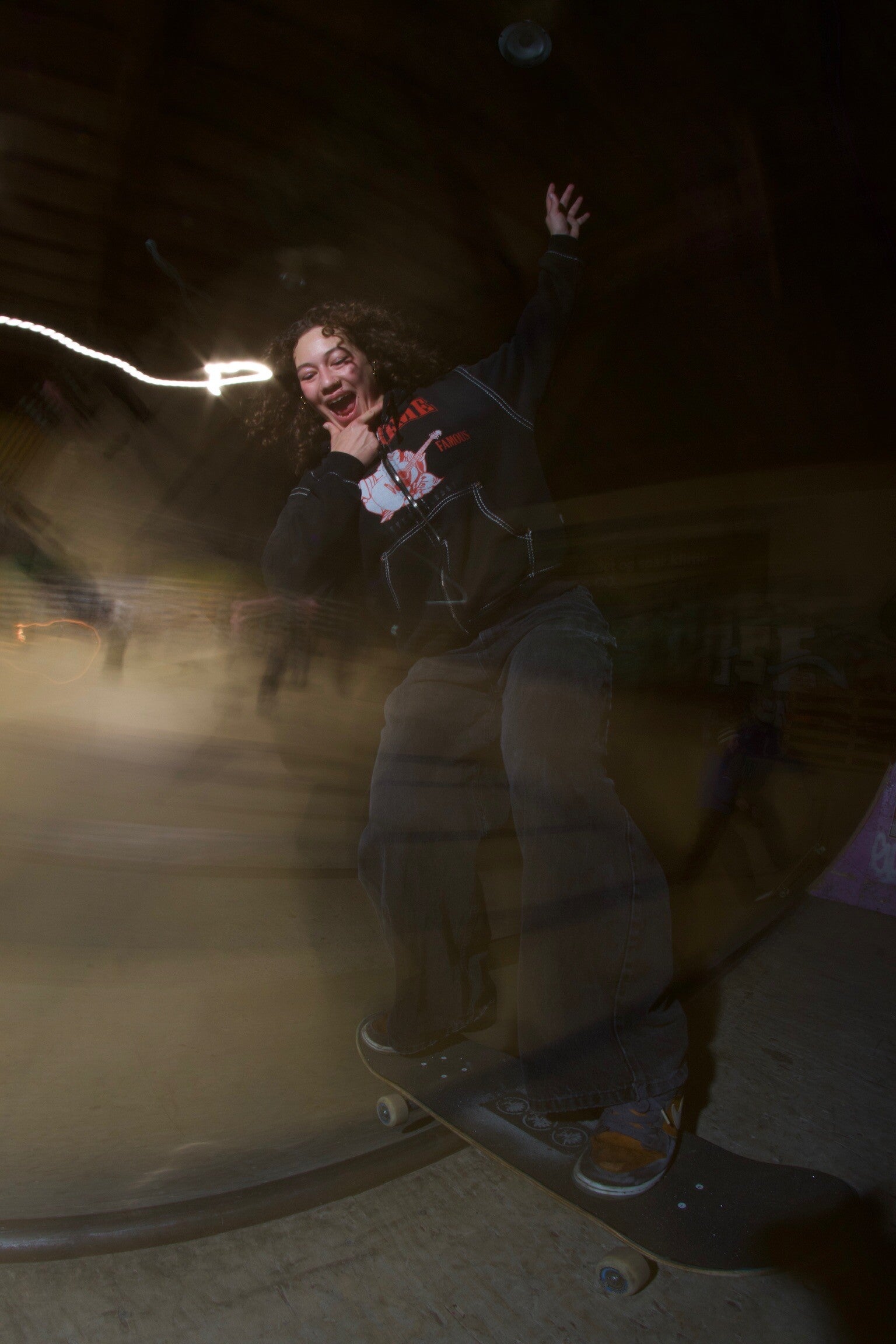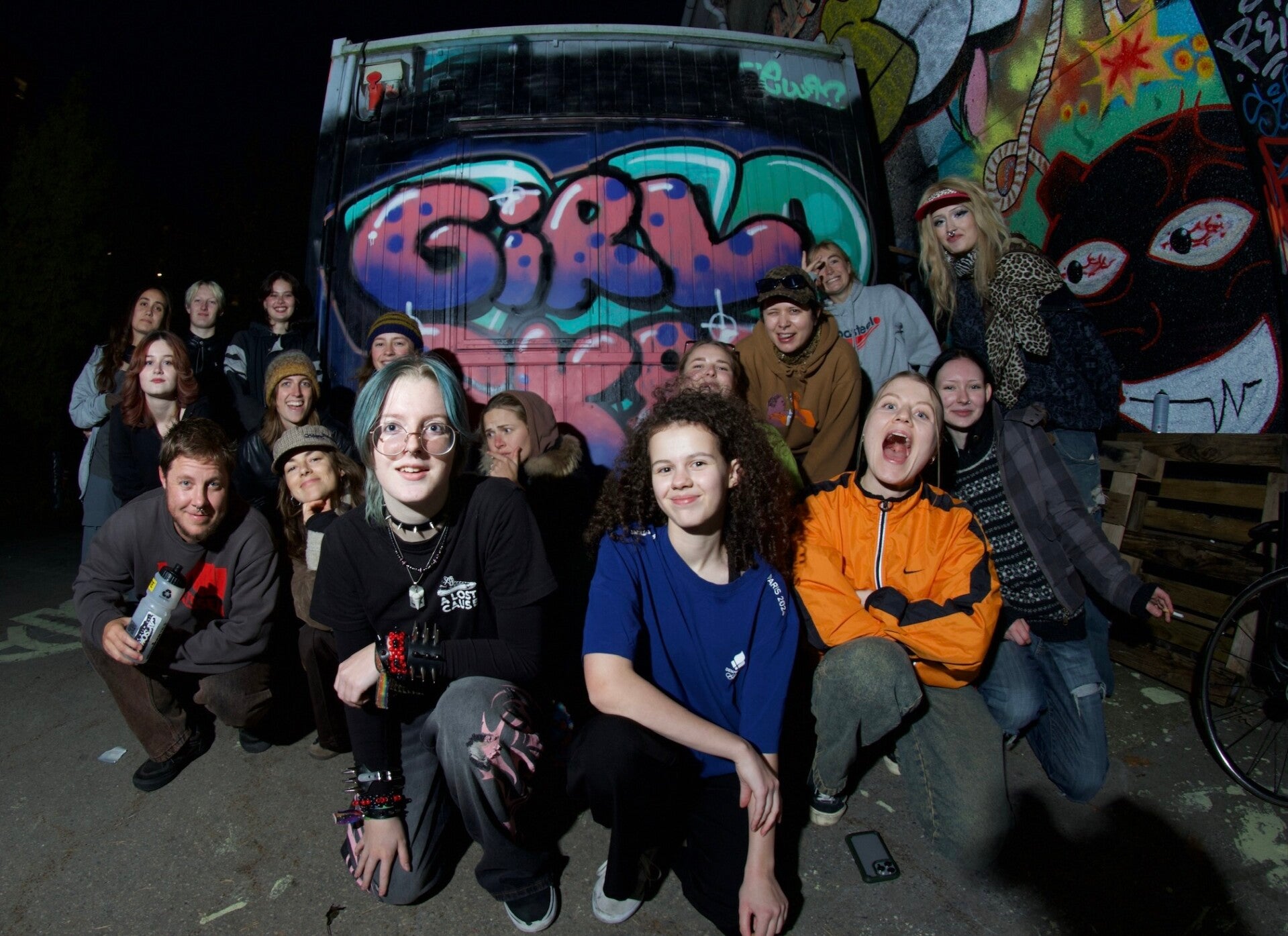 Vi blev positivt overrasket over hvor mange der kom og havde session på. Der skal ikke meget til at lave et fedt event, når vi udnytter hinandens mange talenter. Nynne kom og lavede den fedeste grafittiworkshop, hvor vi endte med at lave et piece sammen, og flere gav den gas med egne værker. Det skal vi klart gøre igen! Mørket faldt på og vi fik tændt diskolyset, så Simone, som viser sig at være nordisk mester i hiphop, kunne lære os en hiphop koreografi, der inkluderede Doechii, bølgen og en masse gåen ned i knæ.